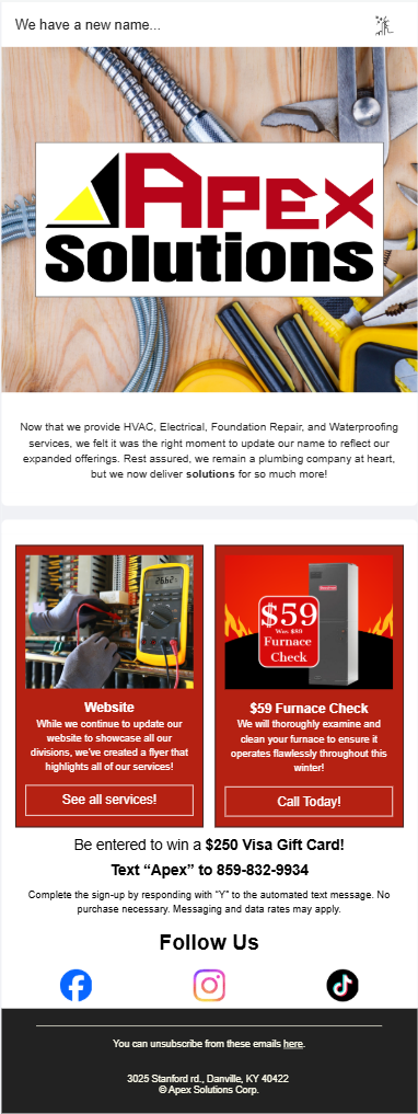 Role: Serve as project manager and oversee every aspect of this rebrand. I needed to make sure the company had everything ready to serve the community as Apex Solutions and to start building brand recognition.